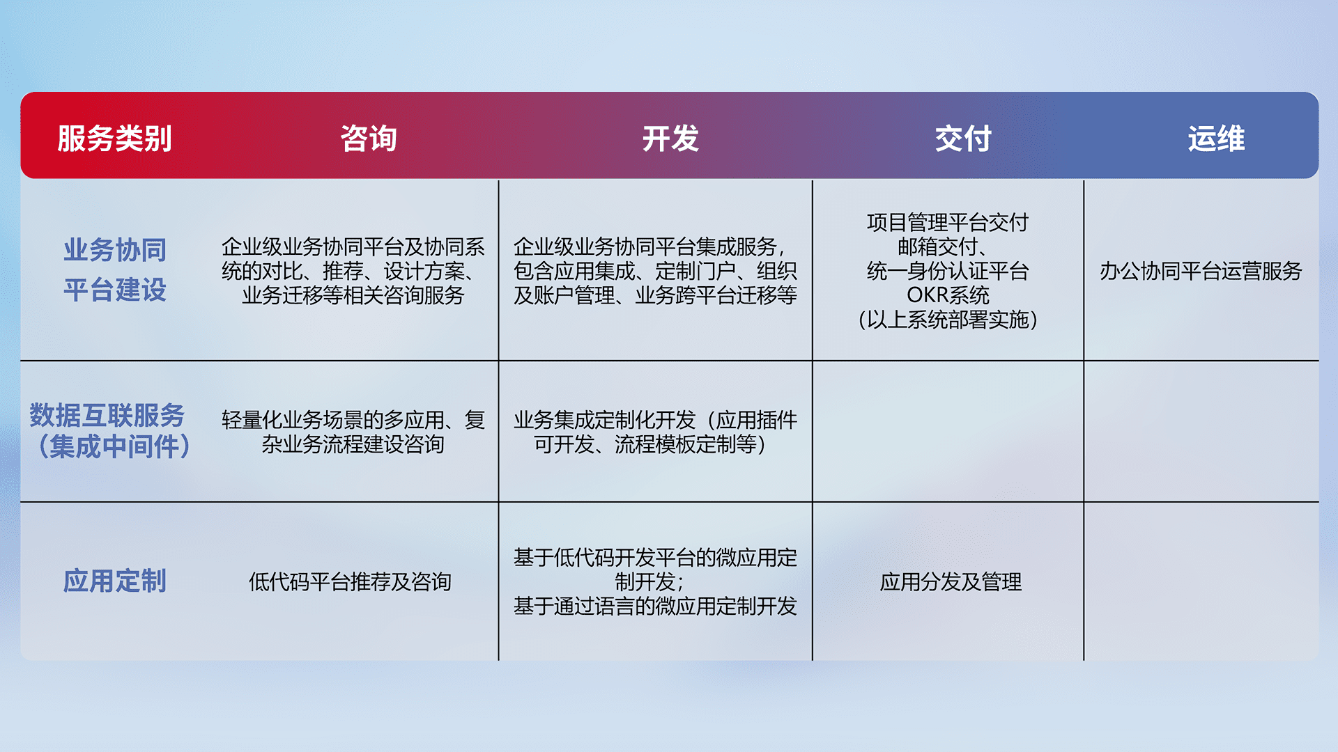 针对钉钉、、、、企微、、、、IDaas等平台级产品提供产品的规划、、方案、、、交付、、、、定制化开发等服务,,,,实现如统一协同办公、、、智能客户服务、、、、混合会议管理、、、、智能数据查询、、等业务场景,,,实现数字化转型。。